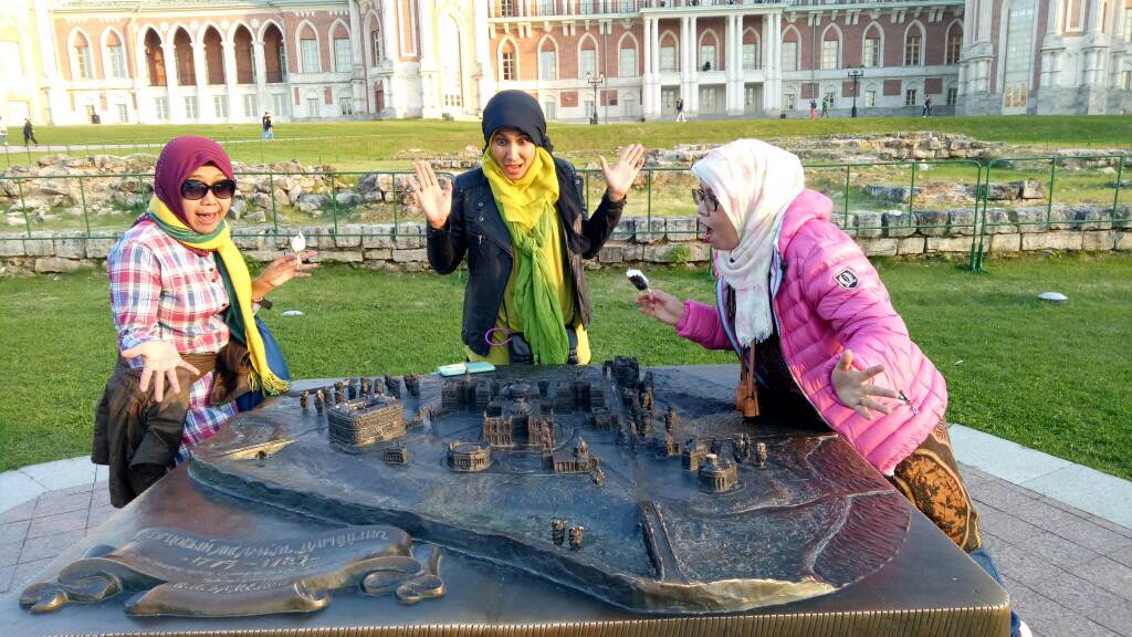 Taman Tsaritsyno:Taman indah sekaligus Museum yang terletak di sebelah selatan Moskow. Tepatnya Dol'skaya Ulitsa 1, Moskova dengan arsitektur bergaya gothic yang dibangun oleh Vasily Bazhenov ,Matvey Kazakov.Didirikan pada tahun 1984 untuk Chaterine II.Awalnya istana ini diperuntukan untuk Istana Musim Panas yang dipenuhi oleh perabotan dan lampu" kristal terbuat dari emas.Kami sampai disini sudah sore sementara TL tidak tahu jam berapa tutup istananya.Persis jam 16.00 kami memasuki pelataran ternyata baru saja tutup.walah padahal kami ke sini untuk memakai Kostum Traditional Rusia dengan tarif 500 Rubel.